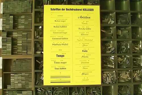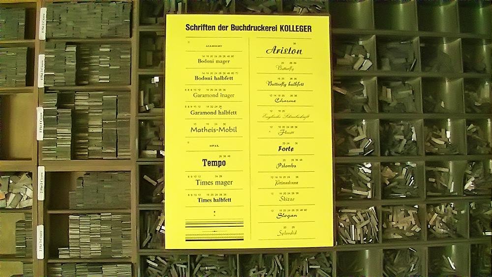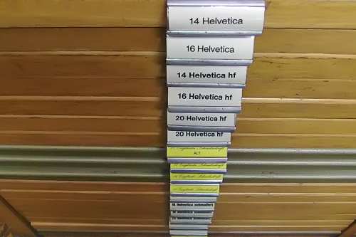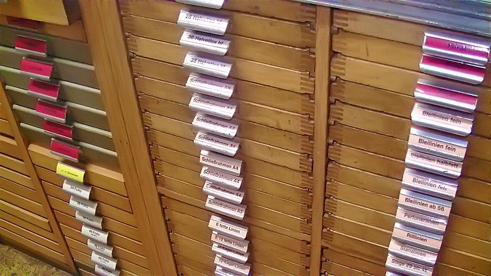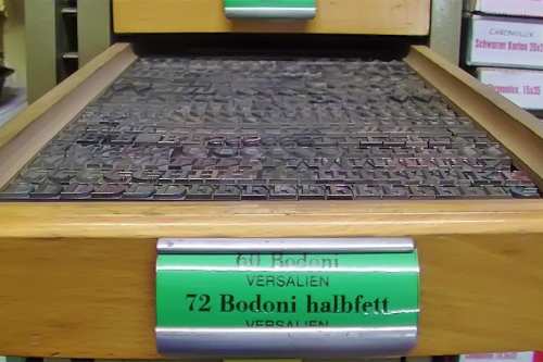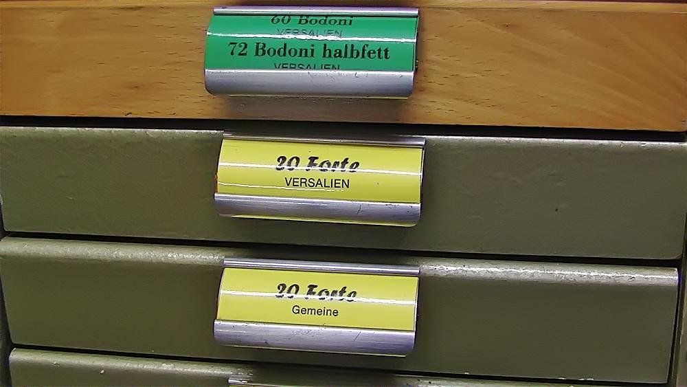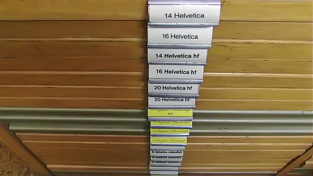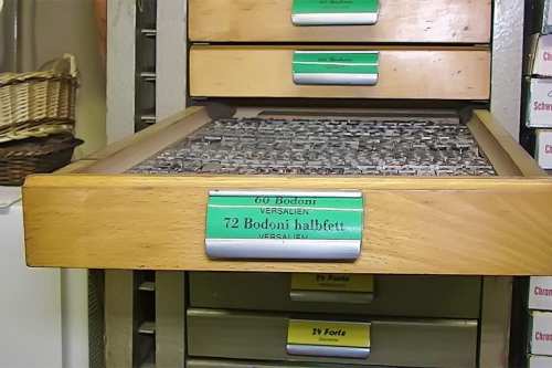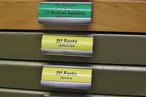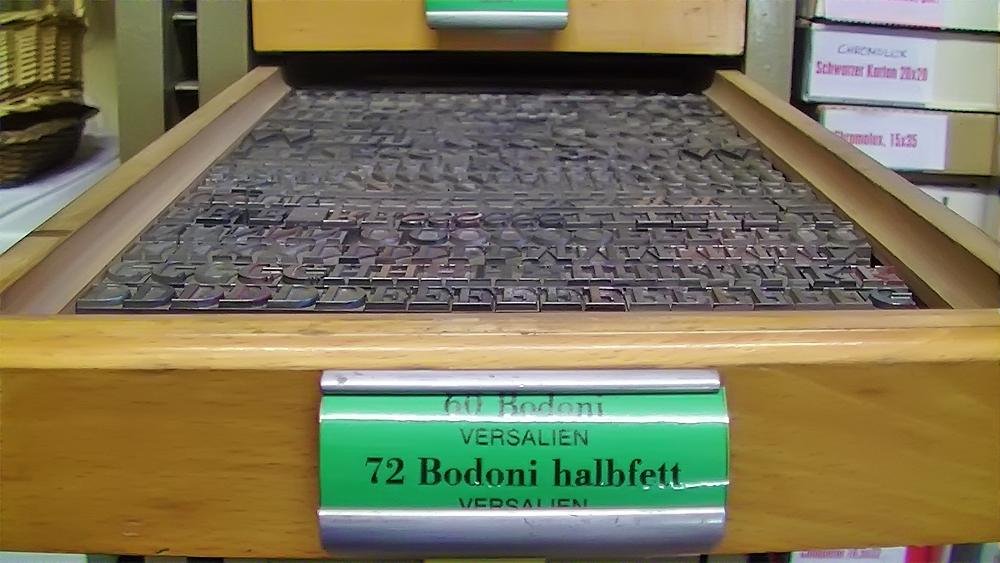 Mit zunehmendem Einbruch der neuen Technologien wurde eine Umstellung in der Produktion notwendig. Das Auflassen des Bleisatzes und Buchdrucks in den meisten Druckereien gab uns die Möglichkeit Mengen an Kostbarkeiten, wie Holzschriften und Handsatzschriften wie sie heutzutage nicht mehr gekannt, zu erwerben. Im Laufe der Jahre wurde aus der Lohnsetzerei eine richtige “Bleiburg”, wo von der Helvetica über Garamond und Bodoni bis hin zur englischen Schreibschrift, einfach alle Schriftcharaktere zu finden sind.