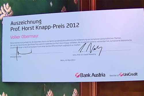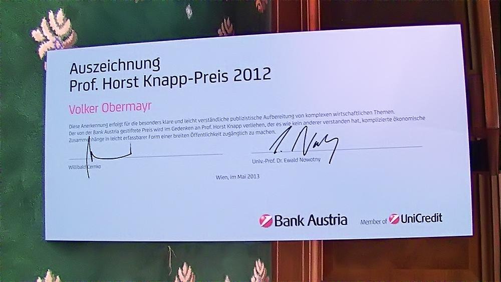 Am Dienstag, den 21. Mai 2013 wird die heurige Verleihung des von der Bank Austria gestifteten, jährlich vergebenen Prof. Horst Knapp-Preises stattfinden.