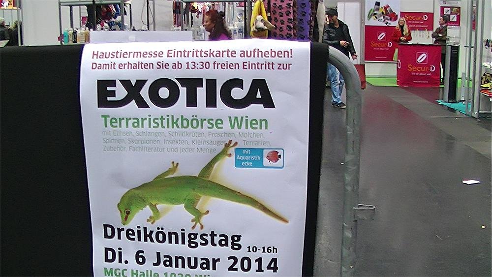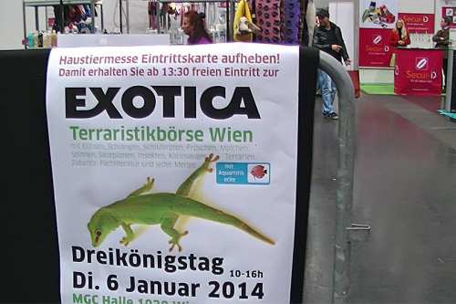 Aufgrund von Erpressung und Nötigung können leider keine Reptilienzüchter am Messegelände Wien mehr Ihre Nachzuchten anbieten, es gibt aber diesmal als besondere Attraktion einen Infostand der Schildkrötenfarm Maria Anzbach, die mehrere über 30 Kilogramm schwere Exemplare der Köhler- und Sporenschildkröte präsentiert und alle Fragen zur Schildkrötenhaltung beantwortet.