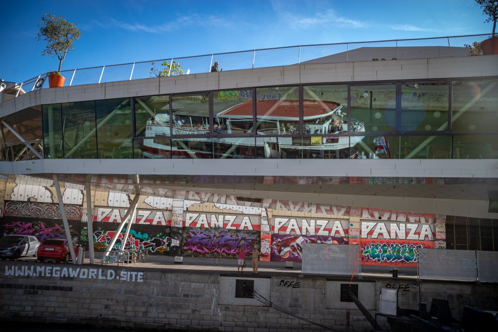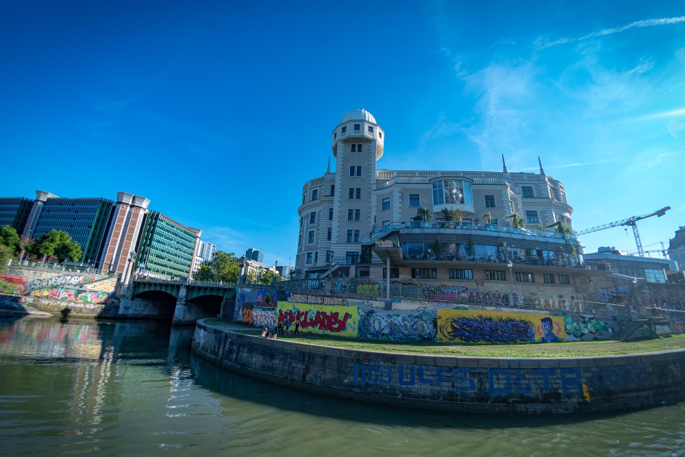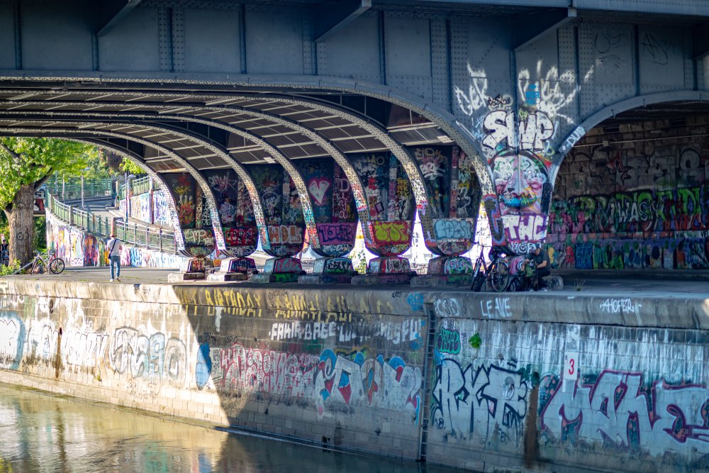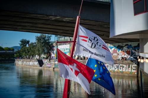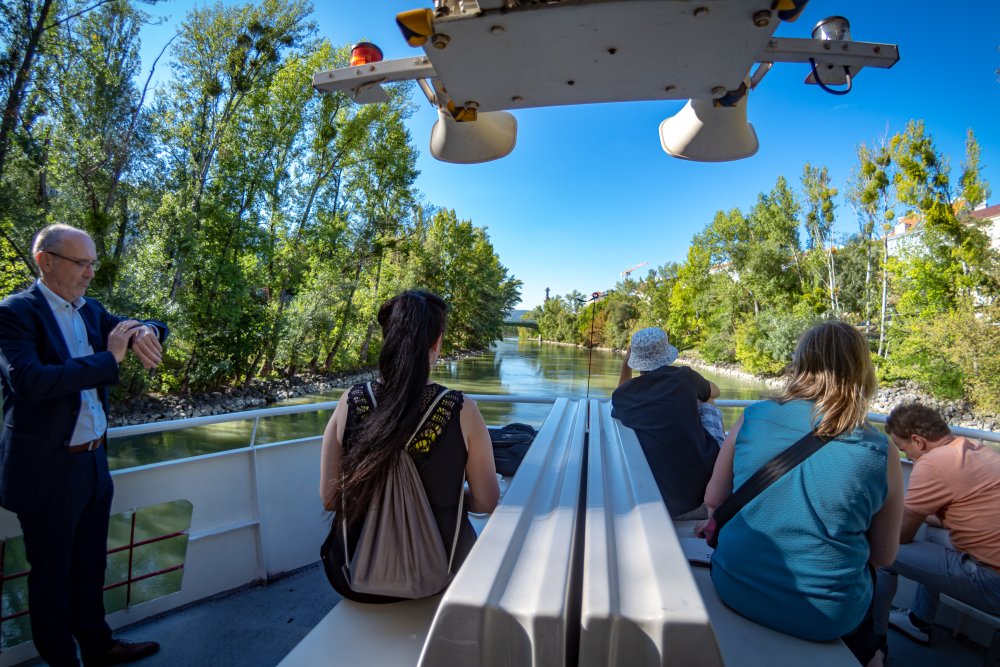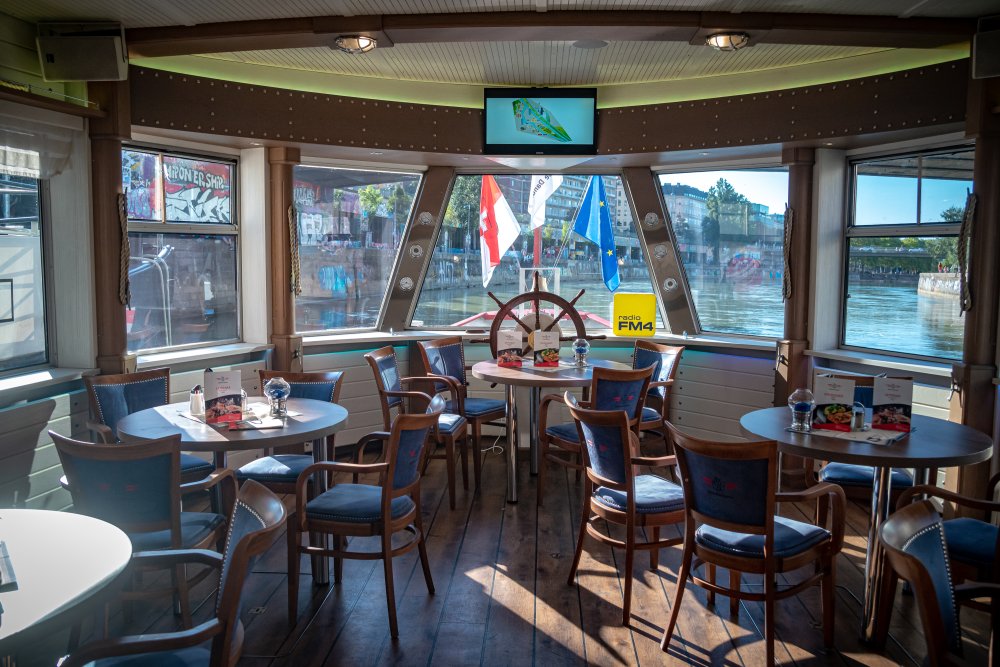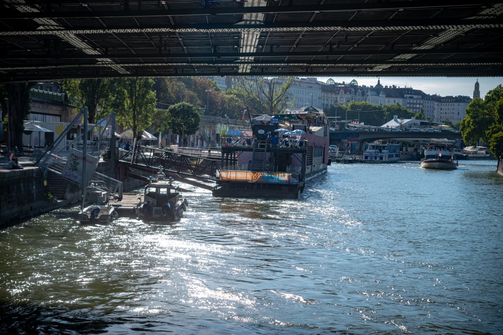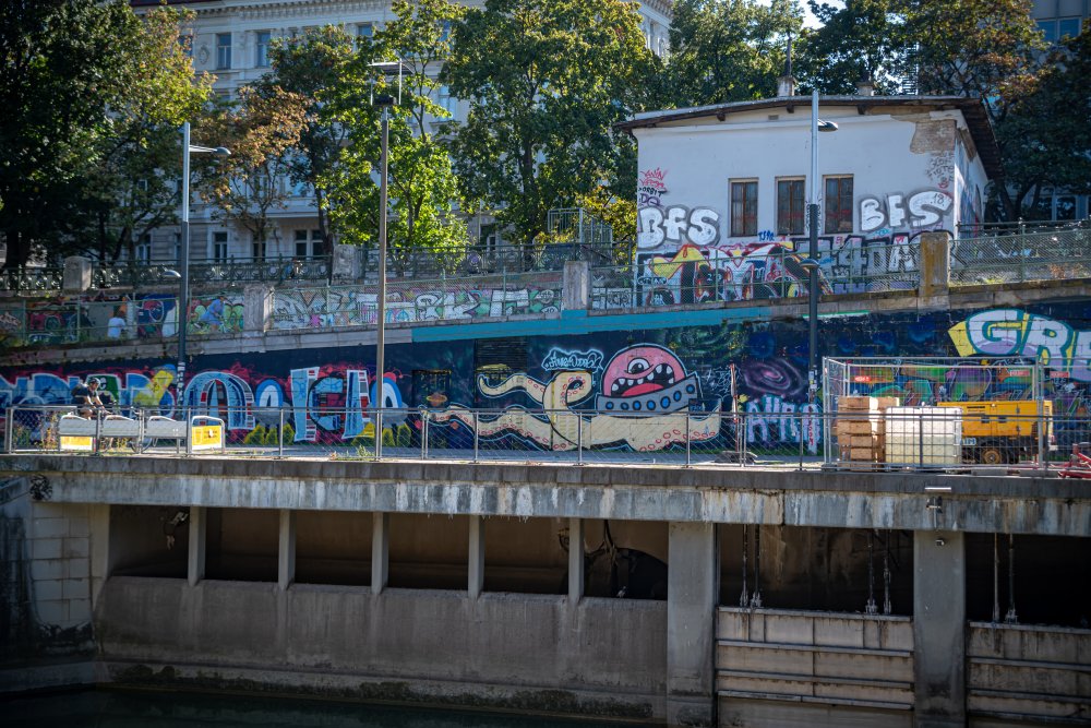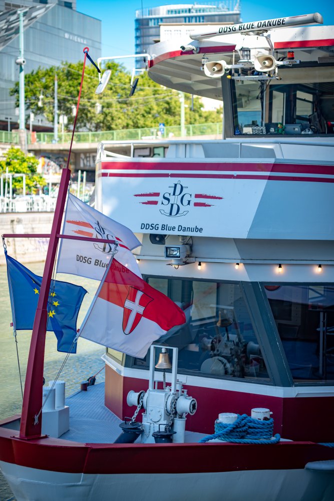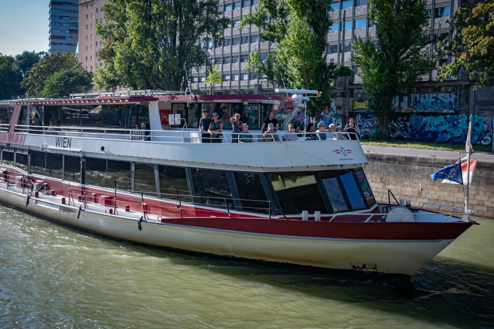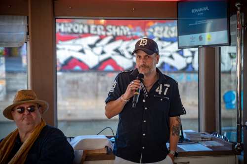 Die Ufer des Donaukanals sind im Bereich der Inneren Stadt nahezu durchgängig mit Graffitis verziert und bilden somit ein Museum der besonderen Art. Bereits in den 1980er Jahren hat hier eine junge Szene begonnen an den begrenzenden Mauern künstlerisch tätig zu werden. Nirgendwo anders in Wien kann man Graffiti Bilder in dieser Dichte bewundern. Auf der etwas mehr als eine Stunde dauernden gestrigen Kick Off Fahrt, welche im Rahmen der City Cruise stattfand, konnten die „Exponate“ vom exklusiven Kapitänssalon aus, mit seinem kleinen Freideck, besonders gut bewundert werden. Street Art Experten der Levin Statzer Foundation begleiteten diese Schifffahrt und präsentierten Wissenswertes zur Geschichte, zu den Wandbildern und deren Künstler:innen. Vor Ort entstand auch live ein neues Wandbild zum Thema Schiff und DDSG Blue Danube.