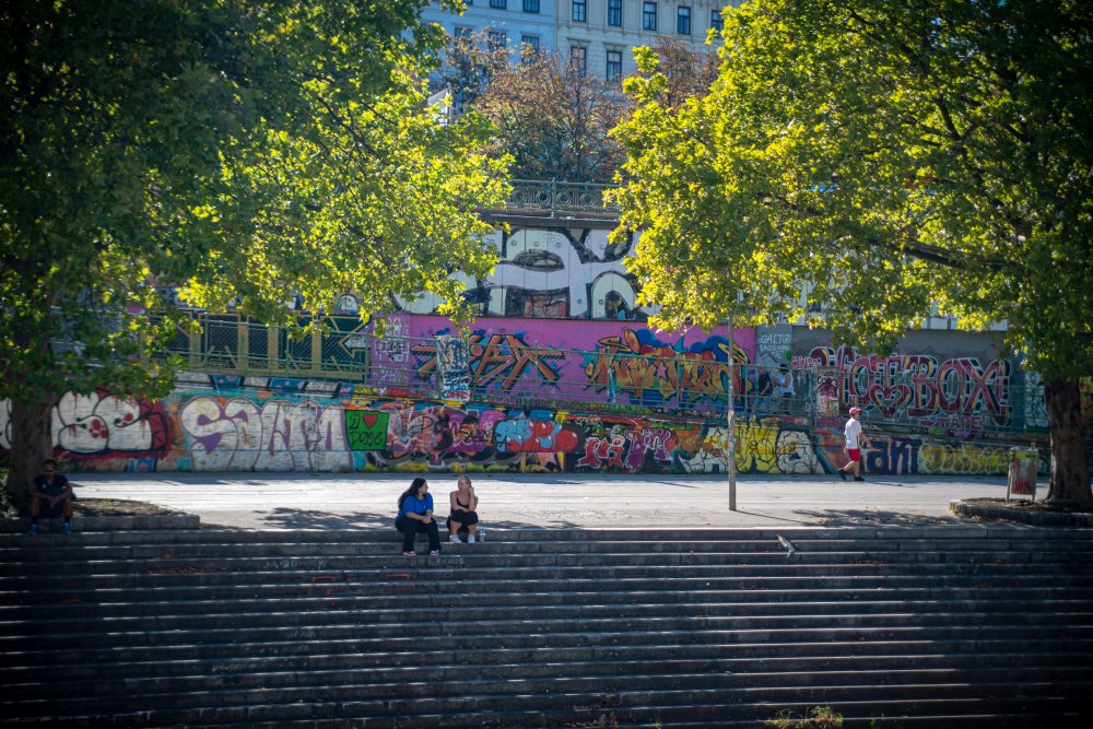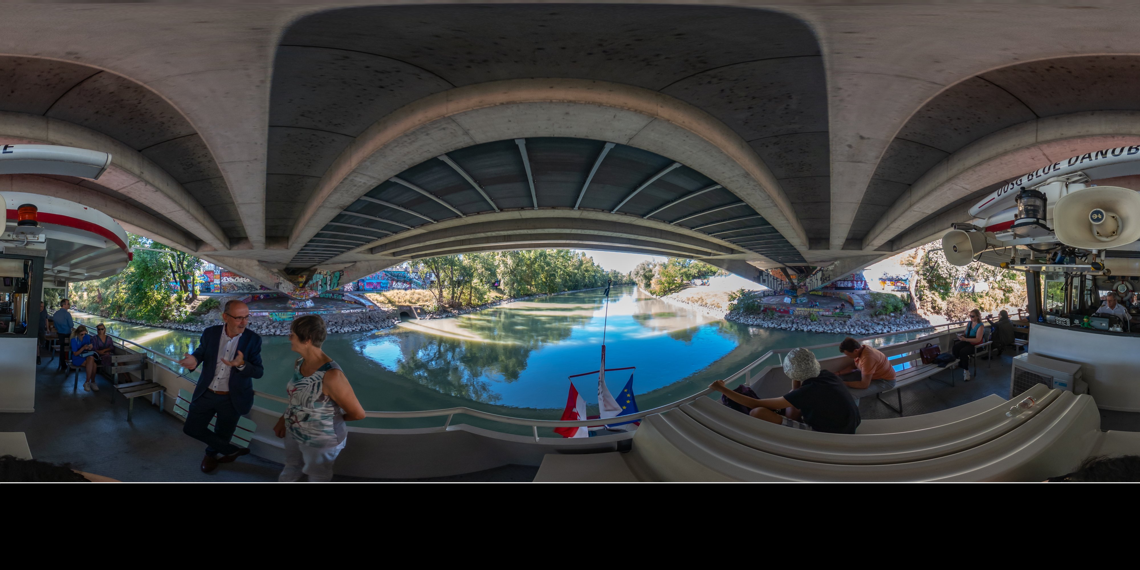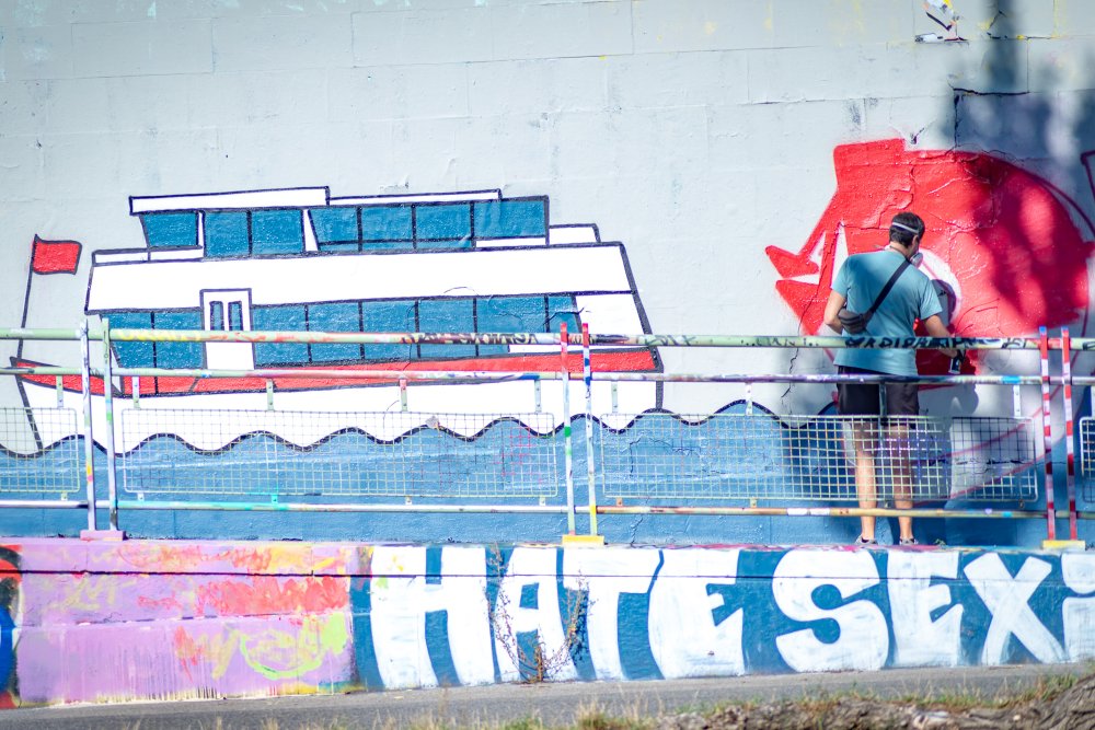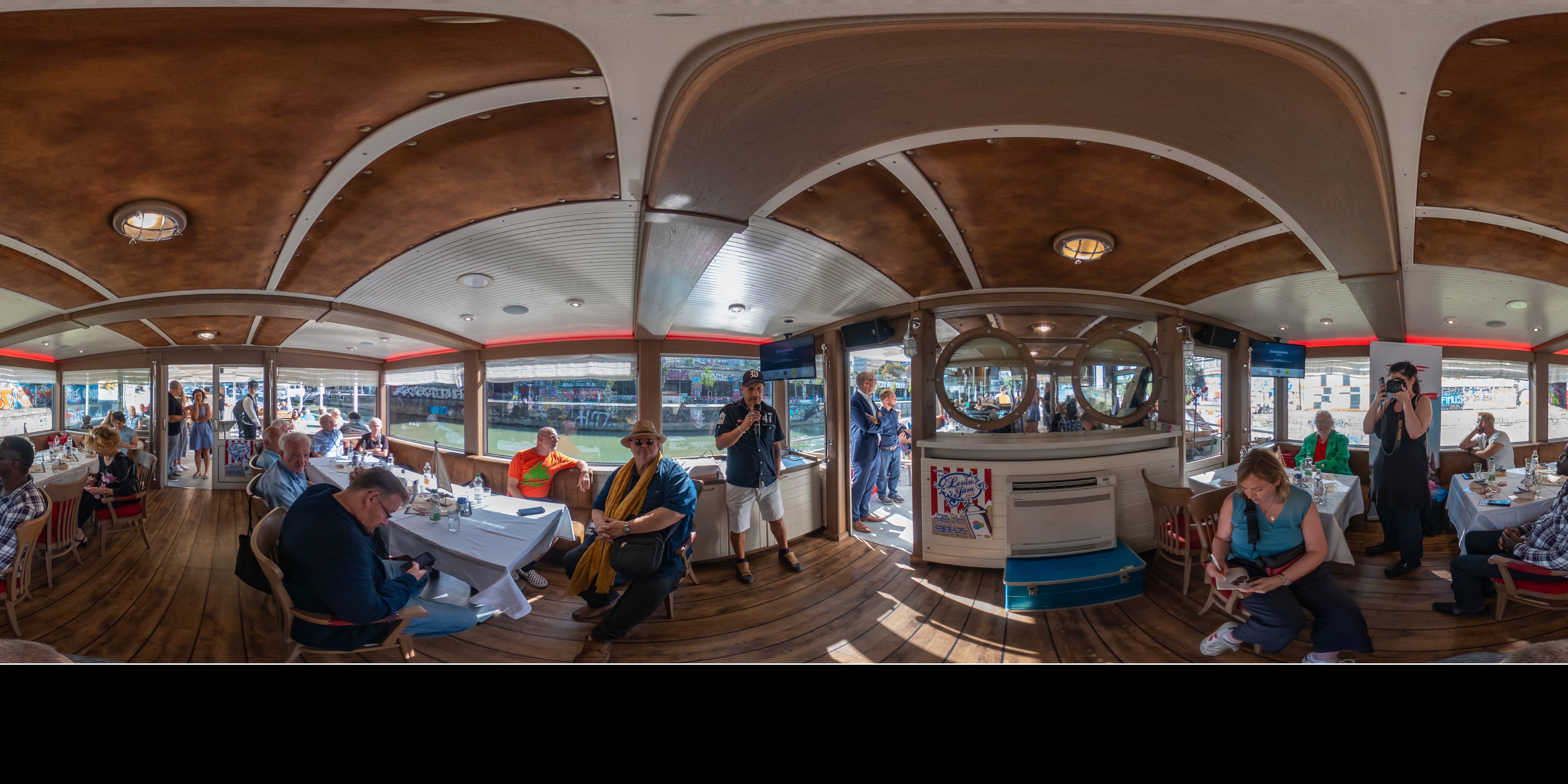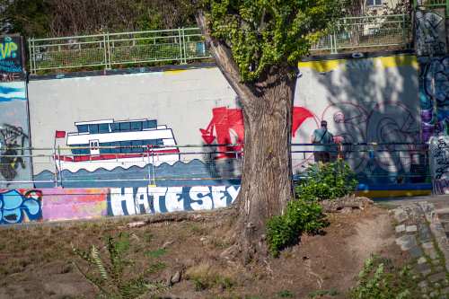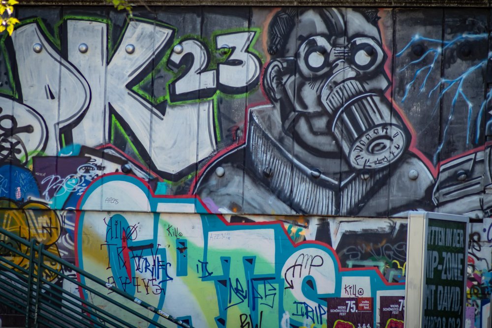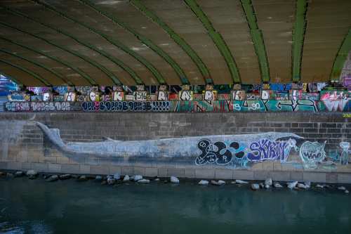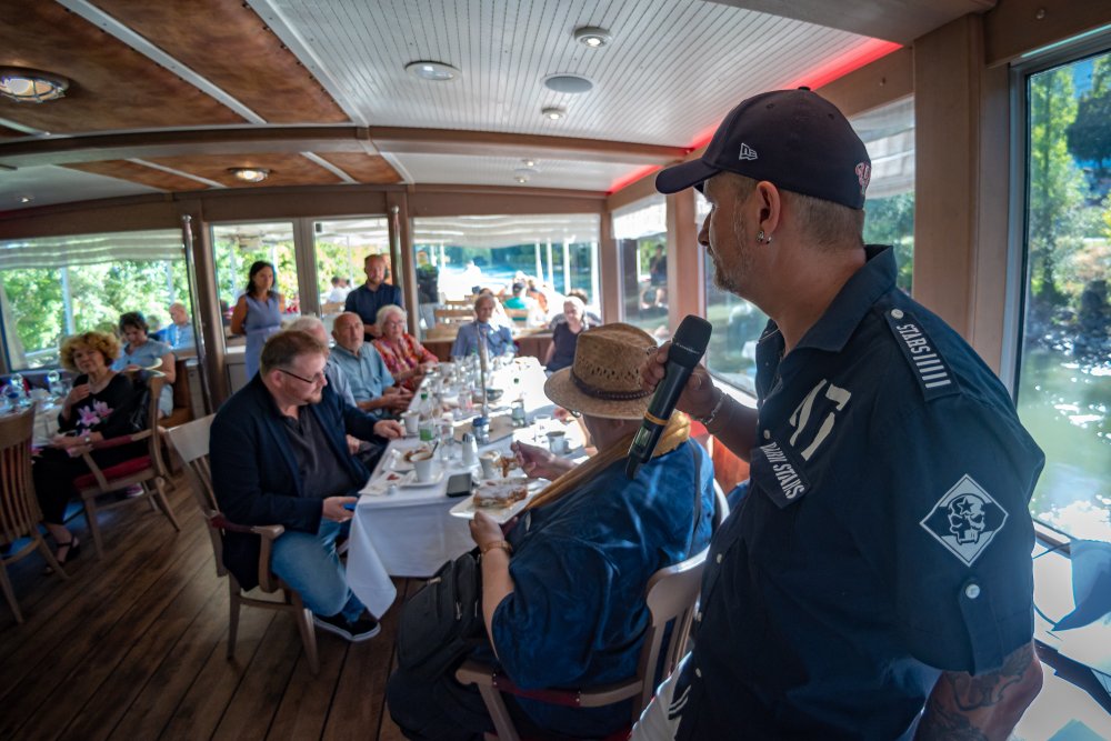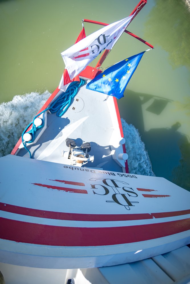 Die Ufer des Donaukanals sind im Bereich der Inneren Stadt nahezu durchgängig mit Graffitis verziert und bilden somit ein Museum der besonderen Art. Bereits in den 1980er Jahren hat hier eine junge Szene begonnen an den begrenzenden Mauern künstlerisch tätig zu werden. Nirgendwo anders in Wien kann man Graffiti Bilder in dieser Dichte bewundern. Auf der etwas mehr als eine Stunde dauernden gestrigen Kick Off Fahrt, welche im Rahmen der City Cruise stattfand, konnten die „Exponate“ vom exklusiven Kapitänssalon aus, mit seinem kleinen Freideck, besonders gut bewundert werden. Street Art Experten der Levin Statzer Foundation begleiteten diese Schifffahrt und präsentierten Wissenswertes zur Geschichte, zu den Wandbildern und deren Künstler:innen. Vor Ort entstand auch live ein neues Wandbild zum Thema Schiff und DDSG Blue Danube.