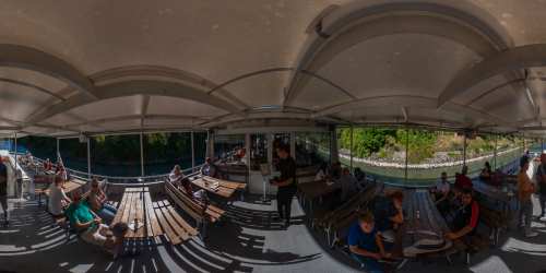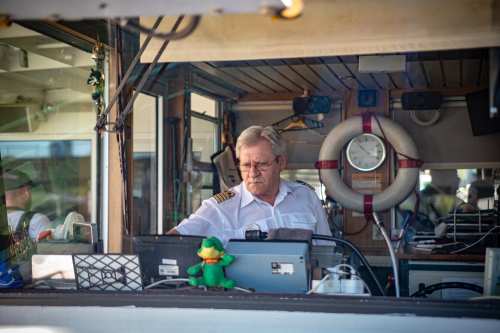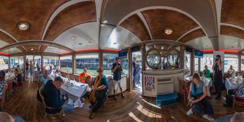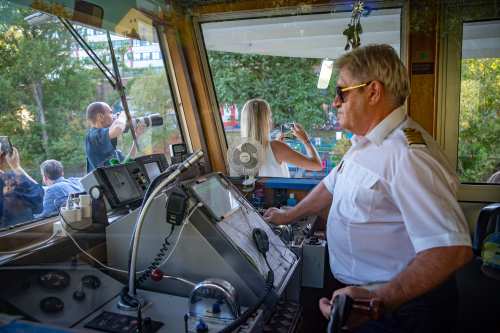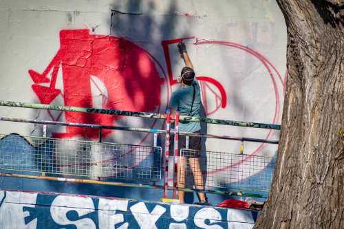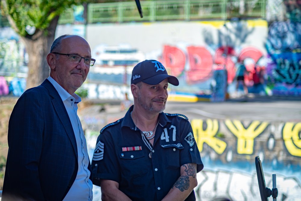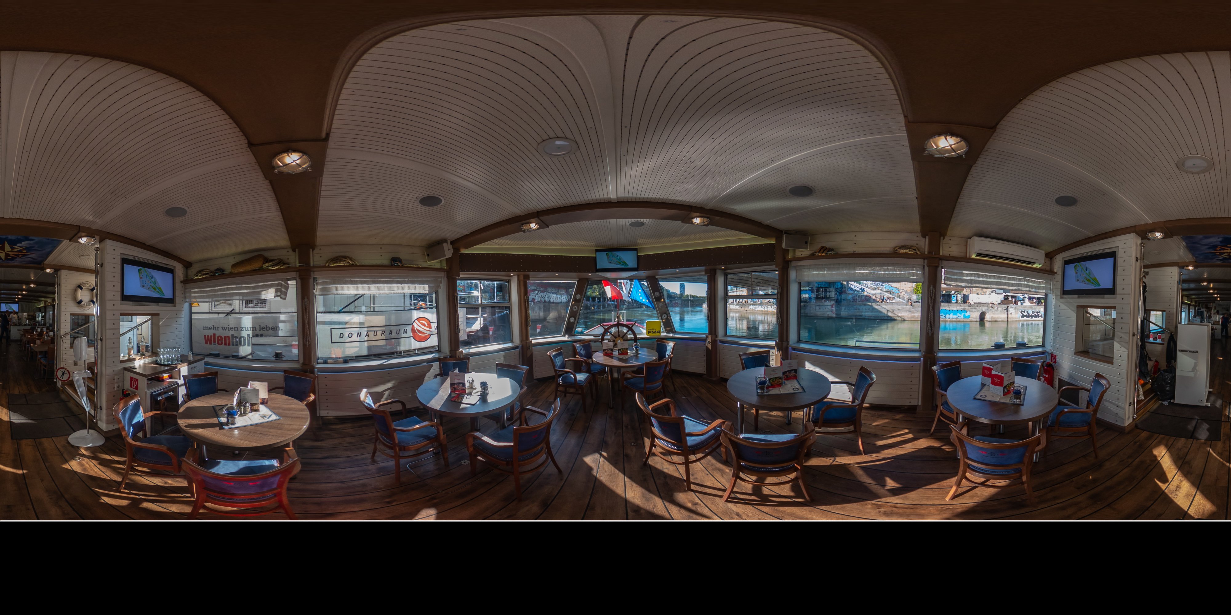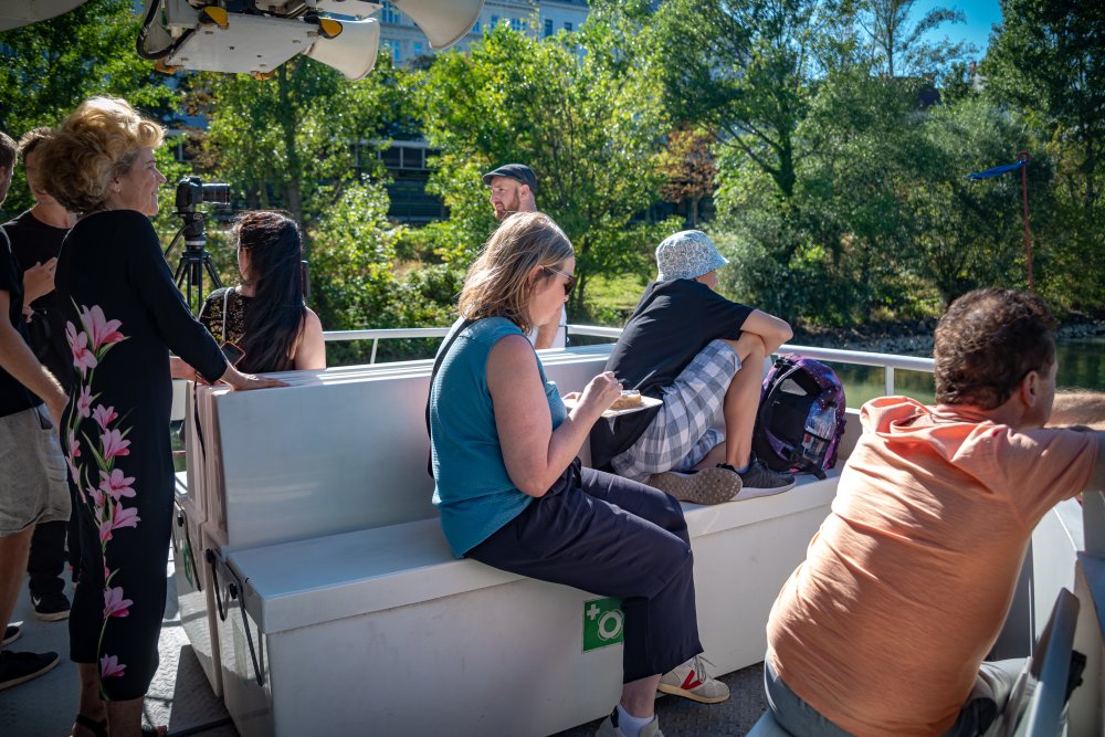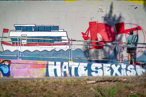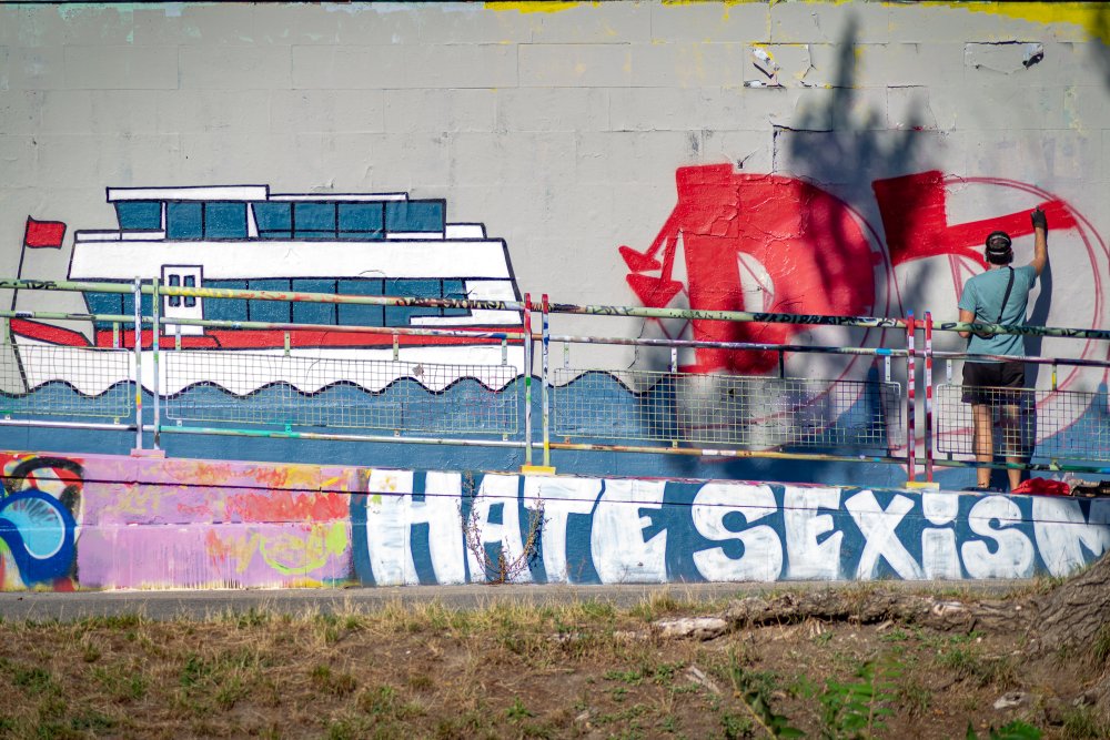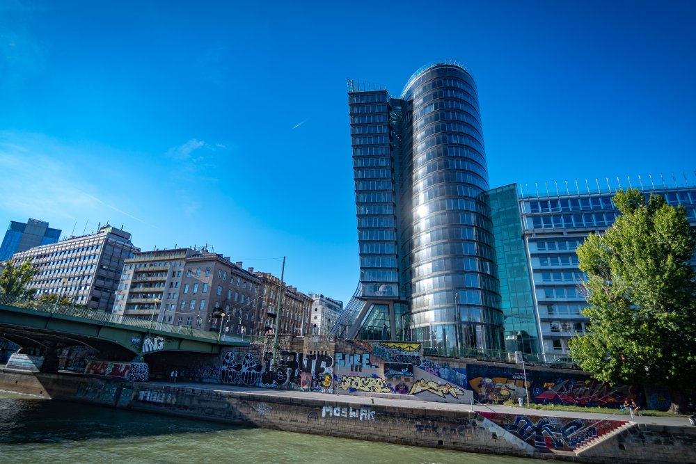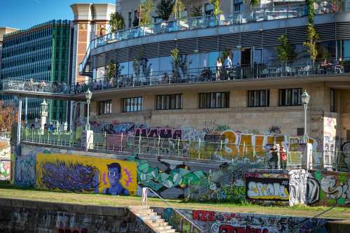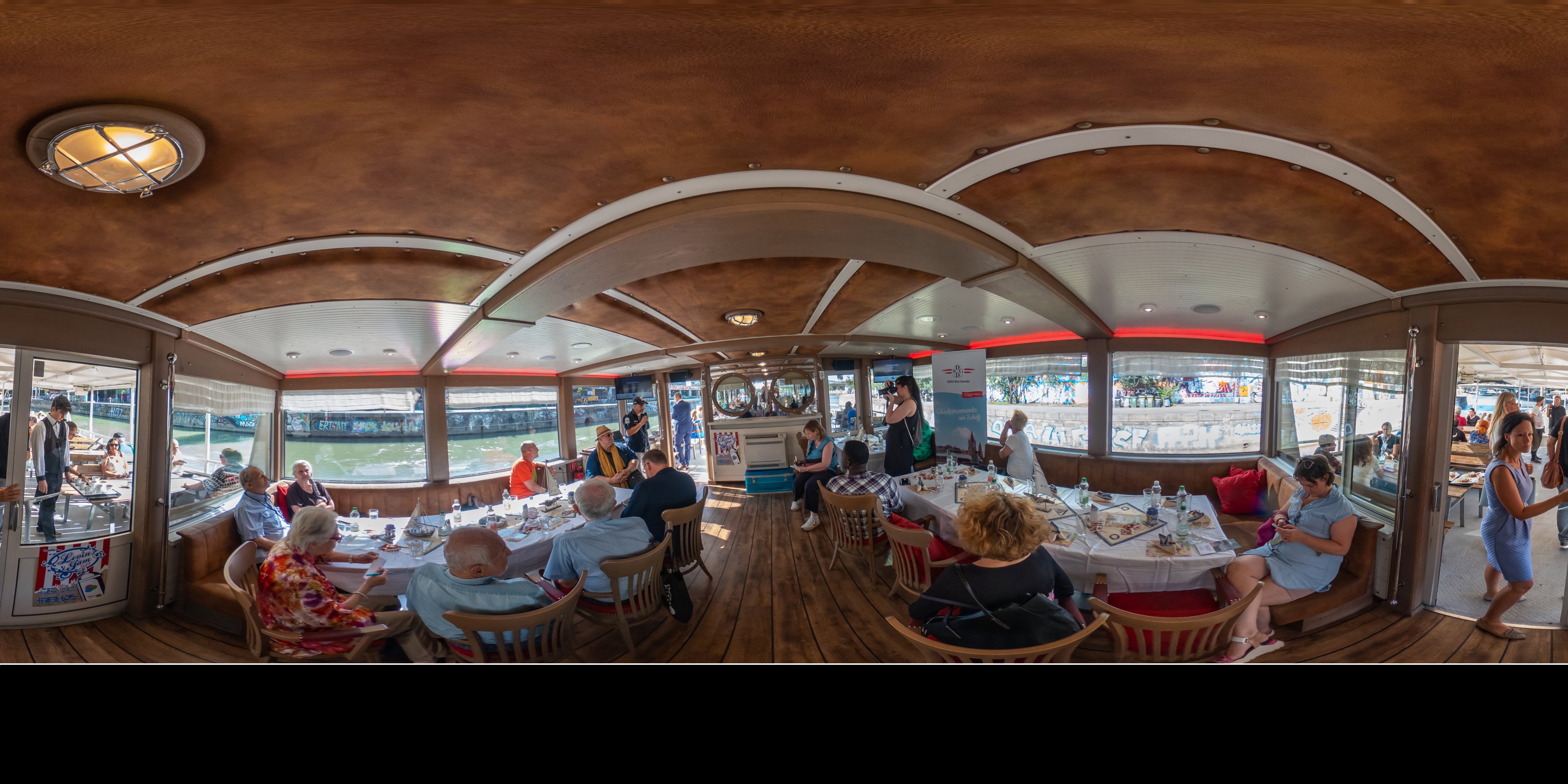 Die Ufer des Donaukanals sind im Bereich der Inneren Stadt nahezu durchgängig mit Graffitis verziert und bilden somit ein Museum der besonderen Art. Bereits in den 1980er Jahren hat hier eine junge Szene begonnen an den begrenzenden Mauern künstlerisch tätig zu werden. Nirgendwo anders in Wien kann man Graffiti Bilder in dieser Dichte bewundern. Auf der etwas mehr als eine Stunde dauernden gestrigen Kick Off Fahrt, welche im Rahmen der City Cruise stattfand, konnten die „Exponate“ vom exklusiven Kapitänssalon aus, mit seinem kleinen Freideck, besonders gut bewundert werden. Street Art Experten der Levin Statzer Foundation begleiteten diese Schifffahrt und präsentierten Wissenswertes zur Geschichte, zu den Wandbildern und deren Künstler:innen. Vor Ort entstand auch live ein neues Wandbild zum Thema Schiff und DDSG Blue Danube.